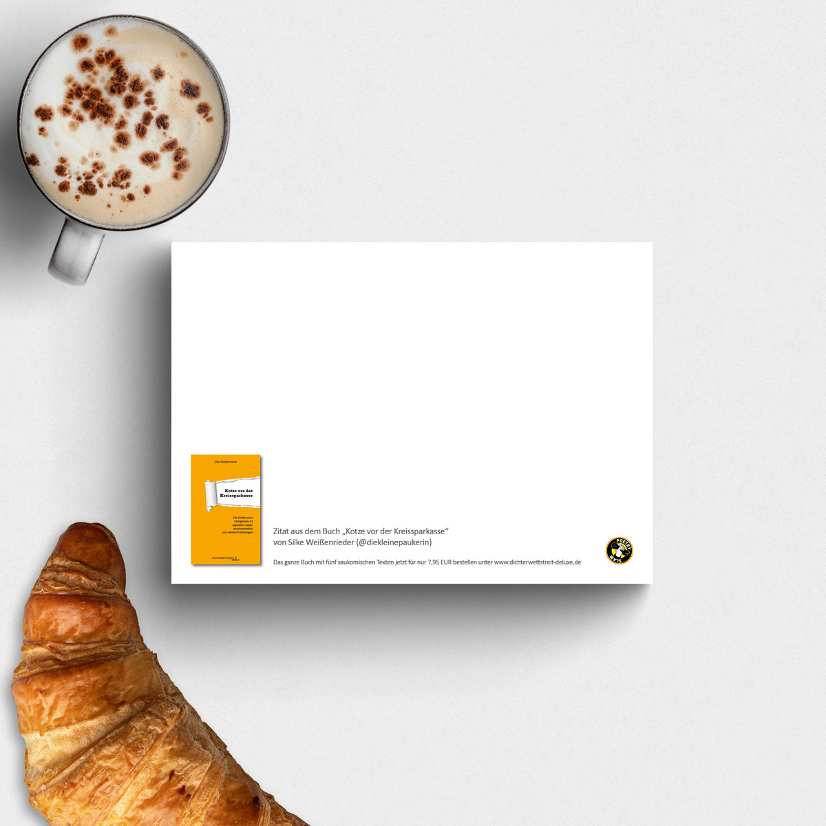 Postkarten zur ersten Textsammlung der Autorin und Lehrerin Silke Weißenrieder: Kotze vor der Kreissparkasse