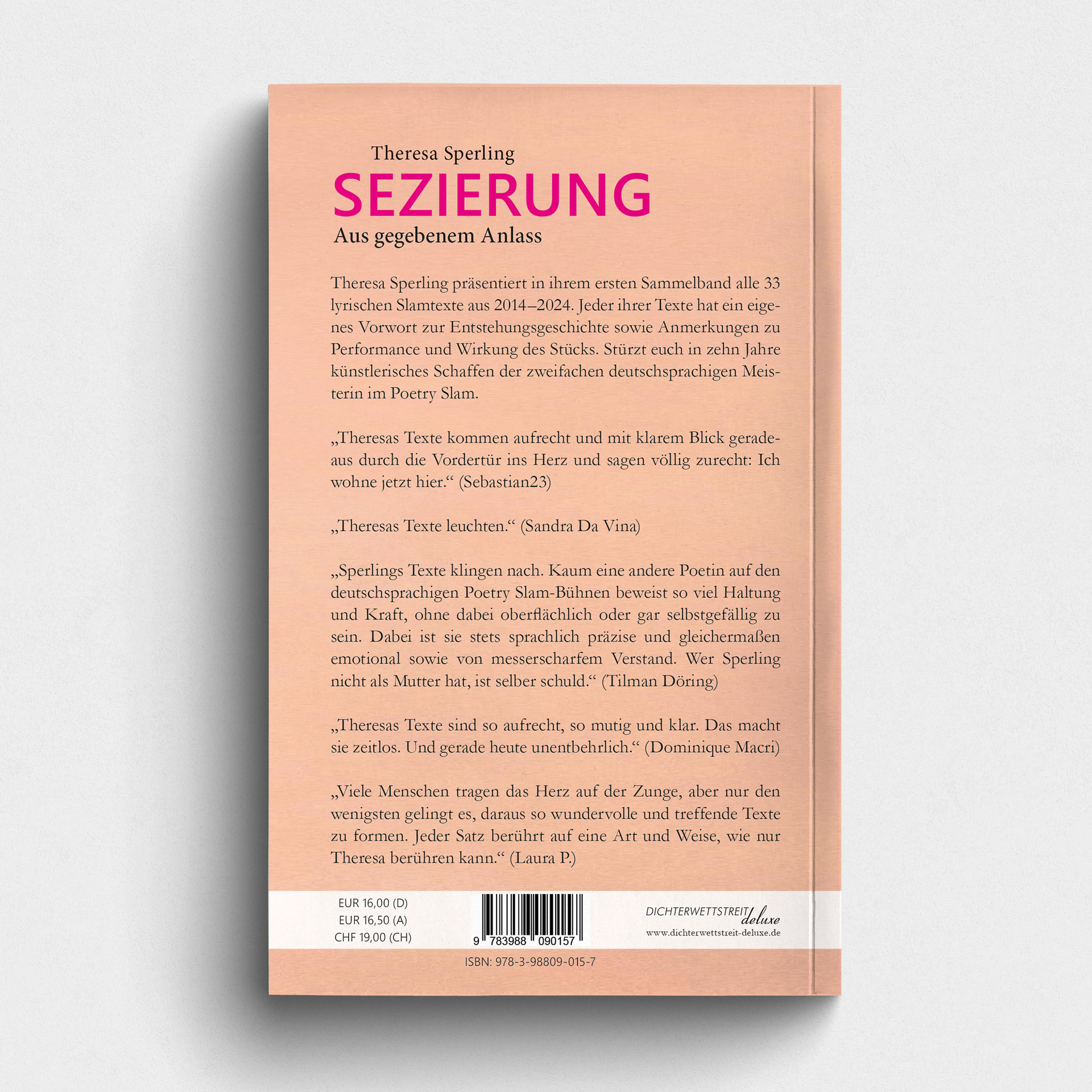 Theresa Sperling präsentiert in ihrem ersten Sammelband alle 33 lyrischen Slamtexte aus 2014–2024. Jeder ihrer Texte hat ein eigenes Vorwort zur Entstehungsgeschichte sowie Anmerkungen zu Performance und Wirkung des Stücks. Stürzt euch in zehn Jahre künstlerisches Schaffen der zweifachen deutschsprachigen Meisterin im Poetry Slam.
